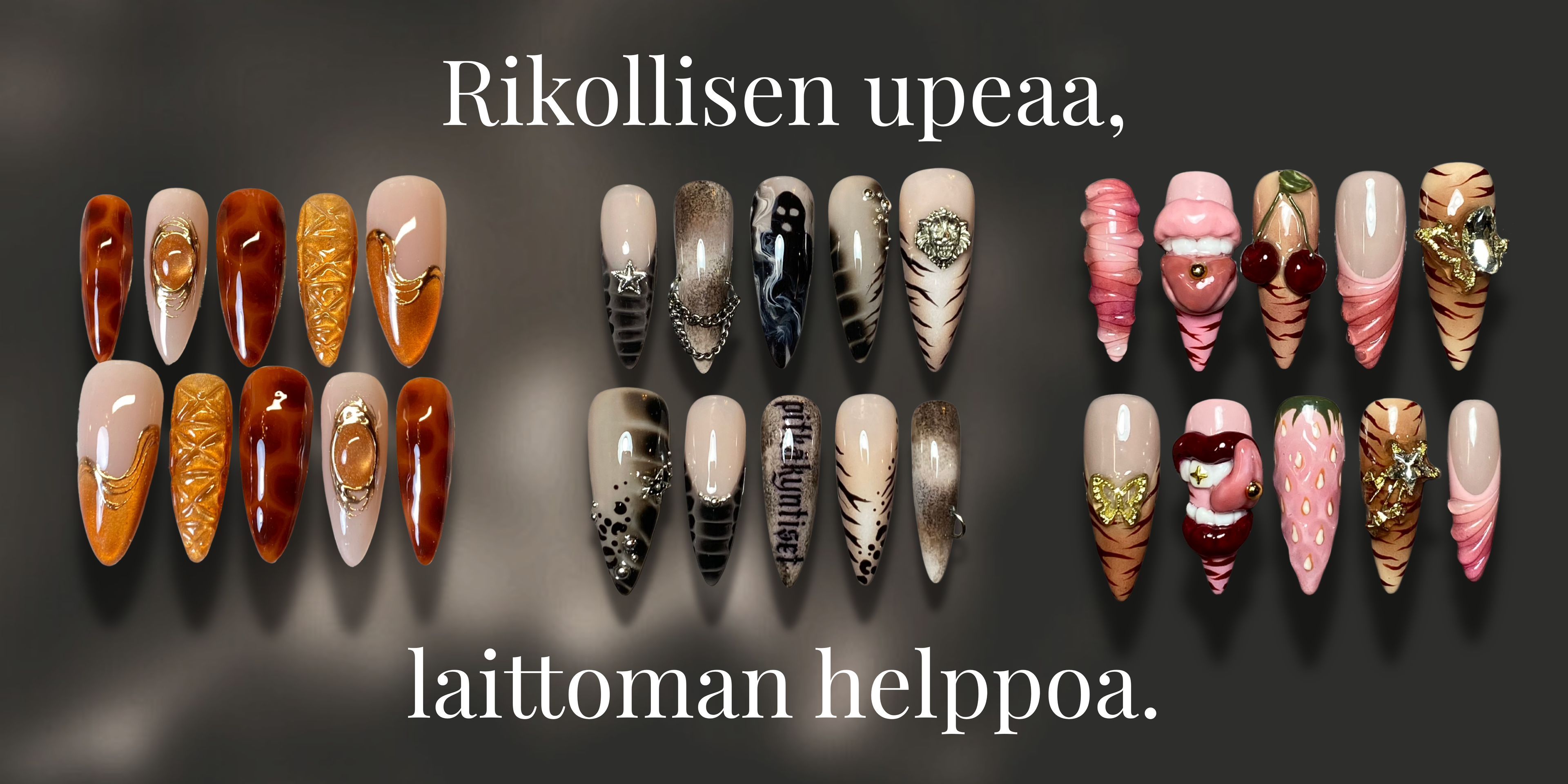 Keikka -Custom tilausMeiltä löydät malleja, jotka herättävät huomiota ja tekevät kynsistäsi katseenvangitsijat. Ja jos haluat juuri omanlaisesi ilmeen, custom-tilauksilla suunnittelemme setin täysin toiveidesi mukaan , minimalistisesta näyttävään.