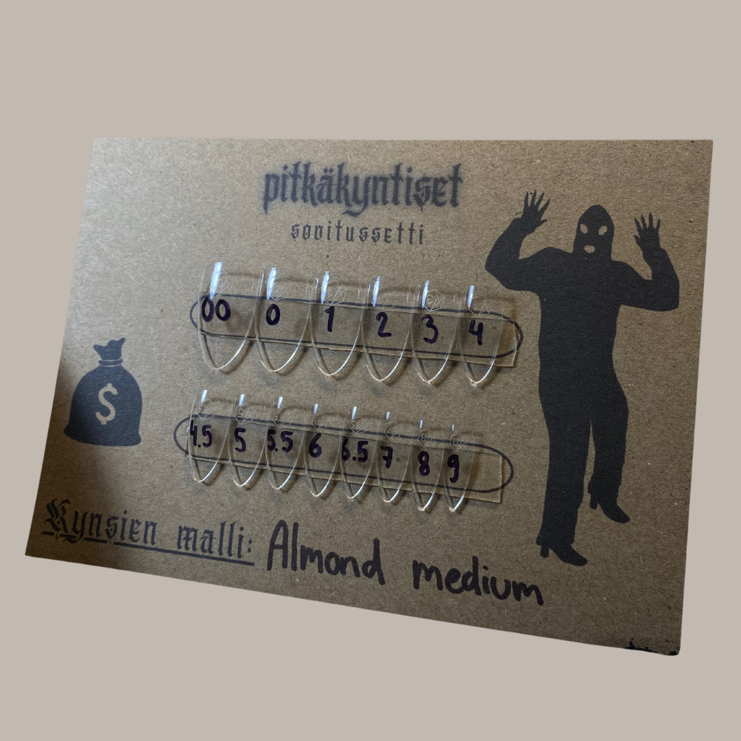 Sovitussetti auttaa sinua löytämään juuri oikeat koot ja välttämään hutiostokset. Setti sisältää kaikki koot valitsemassasi muodossa ja pituudessa, ja voit verrata niitä omiin kynsiisi.